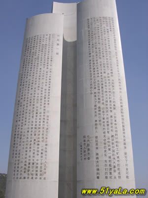 高40公尺的主碑 ,形如一把鋒利的刺刀 。主碑的三個(gè)面上,分別鐫刻著彭真、徐向前、薄一波的題詞。彭真的題詞是“戰(zhàn)績(jī)輝煌,永垂史冊(cè)”;徐向前的題詞是“參加百團(tuán)大戰(zhàn)的烈士們永垂不朽”;薄—波的題詞是“百團(tuán)大戰(zhàn),抗日戰(zhàn)爭(zhēng)中最光輝的一頁,必將載諸史冊(cè),永放光芒。”