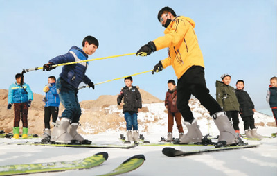 圖為在甘肅省山丹縣佛山滑雪場,近百名中小學(xué)生正在滑雪教練的指導(dǎo)下體驗(yàn)冰雪運(yùn)動(dòng)樂趣。張 淵 攝(人民視覺)