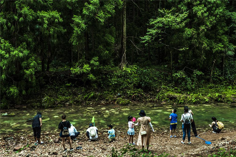 黃石寨是個(gè)“空中孤島”,所以沒(méi)有環(huán)保車,只能索道原路下山,下山不遠(yuǎn)就是金鞭溪的入口。金鞭溪全長(zhǎng)7.5公里,是條絕佳森林伴溪水的徒步路線,只做徒步可以在兩小時(shí)完成,途中如果休息、觀景,一般三小時(shí)可以走到另一出口——水繞四門,這里就又有環(huán)保車了,下一站就是山下的另一景點(diǎn)“十里畫廊”,可以小火車可以徒步,“畫廊”并不長(zhǎng),想拍照還是徒步比較好。