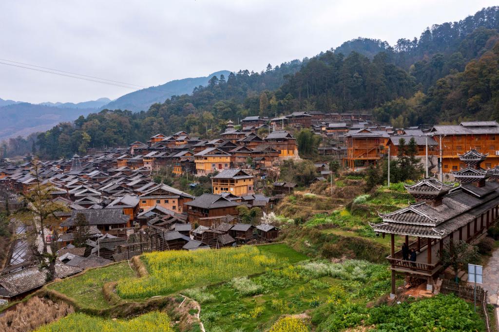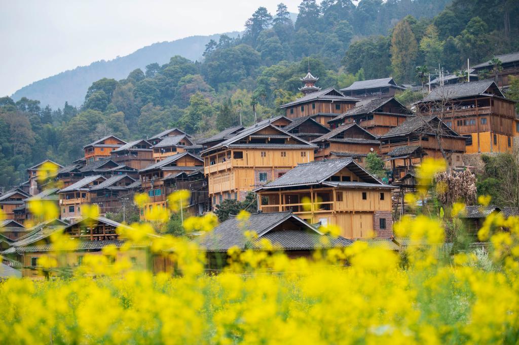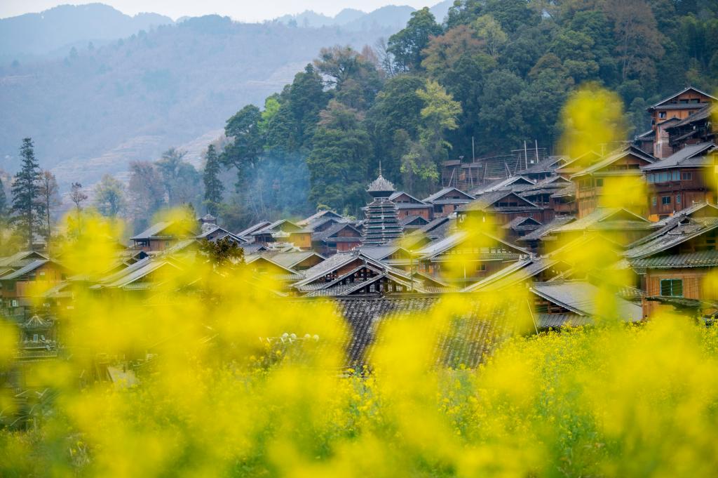 2024年3月10日,貴州省從江縣高增鄉(xiāng)占里侗寨內(nèi)盛開的油菜花與鼓樓、民居相映成景。CICPHOTO/吳德軍 攝