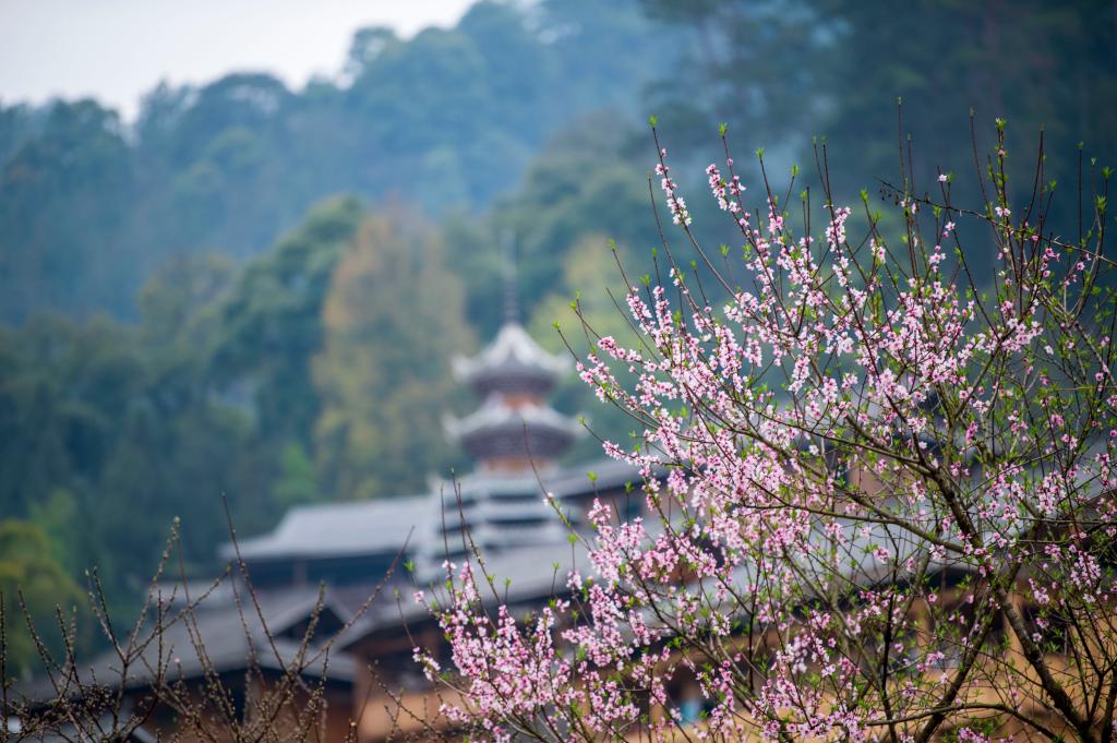 ?? 2024年3月10日,貴州省從江縣高增鄉(xiāng)占里侗寨內(nèi)盛開的桃花與鼓樓相映成景。CICPHOTO/吳德軍 攝