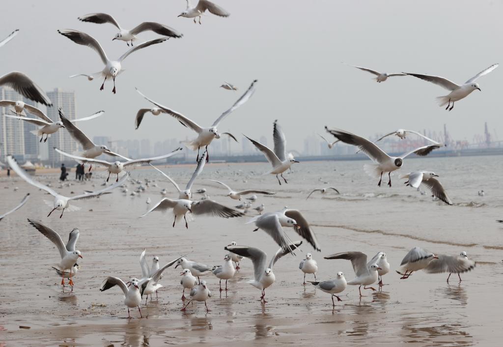 春日和暖,大批海鷗在河北省秦皇島市金夢海灣浴場飛舞、覓食,吸引游客前來觀賞。