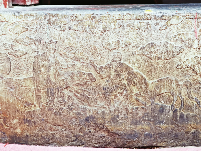 這是在澤州縣金村鎮(zhèn)顯慶寺毗盧殿殿門長(zhǎng)約3米的地伏上雕刻的“西游記”故事浮雕,端詳四幅浮雕,觀者有翻看連環(huán)畫之感!