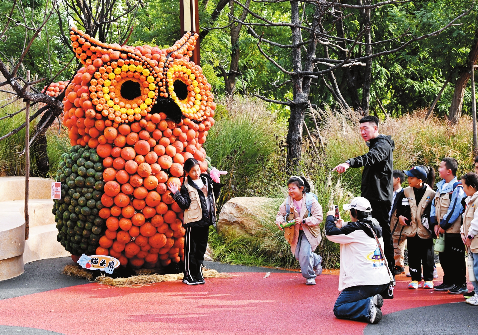 近日,青島東方伊甸園舉行“南瓜藝術(shù)王國”主題展。圖為小朋友在排隊與“南瓜貓頭鷹”合影。 新華社記者 李紫恒 攝