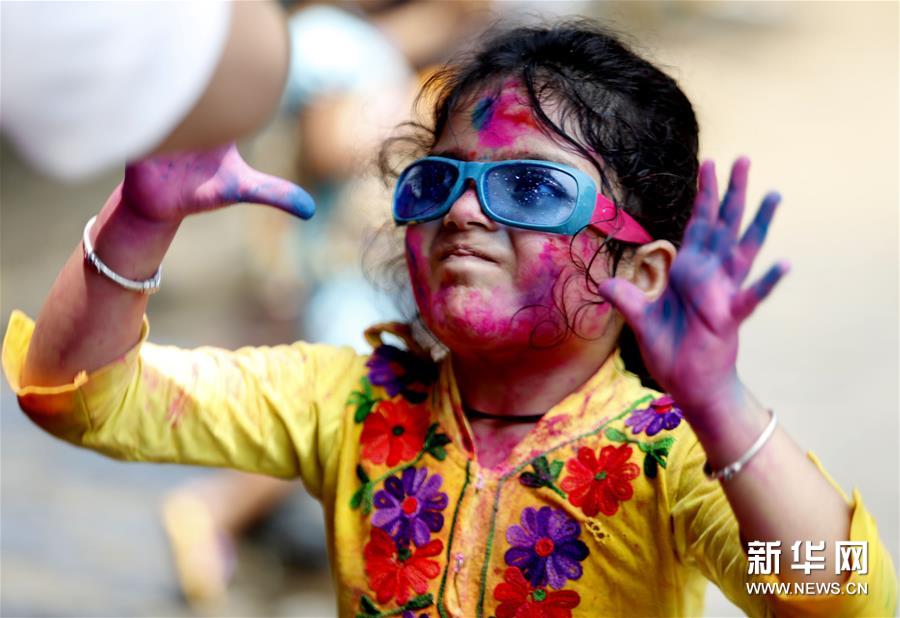 胡里節(jié)也叫“灑紅節(jié)”,人們?cè)谧约耗樕虾蜕砩贤可项伭?,還向別人拋撒五顏六色的顏料和粉末,迎接春天的到來(lái)。新華社發(fā)(吳昂 攝)