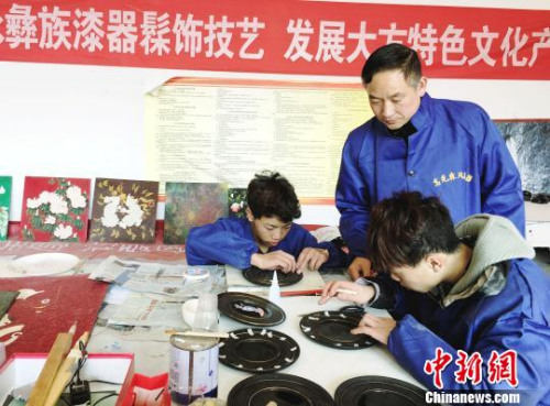 “大方彝族漆器髹飾技藝”貴州省級非遺代表性傳承人高光友指導(dǎo)學(xué)徒制作漆器。