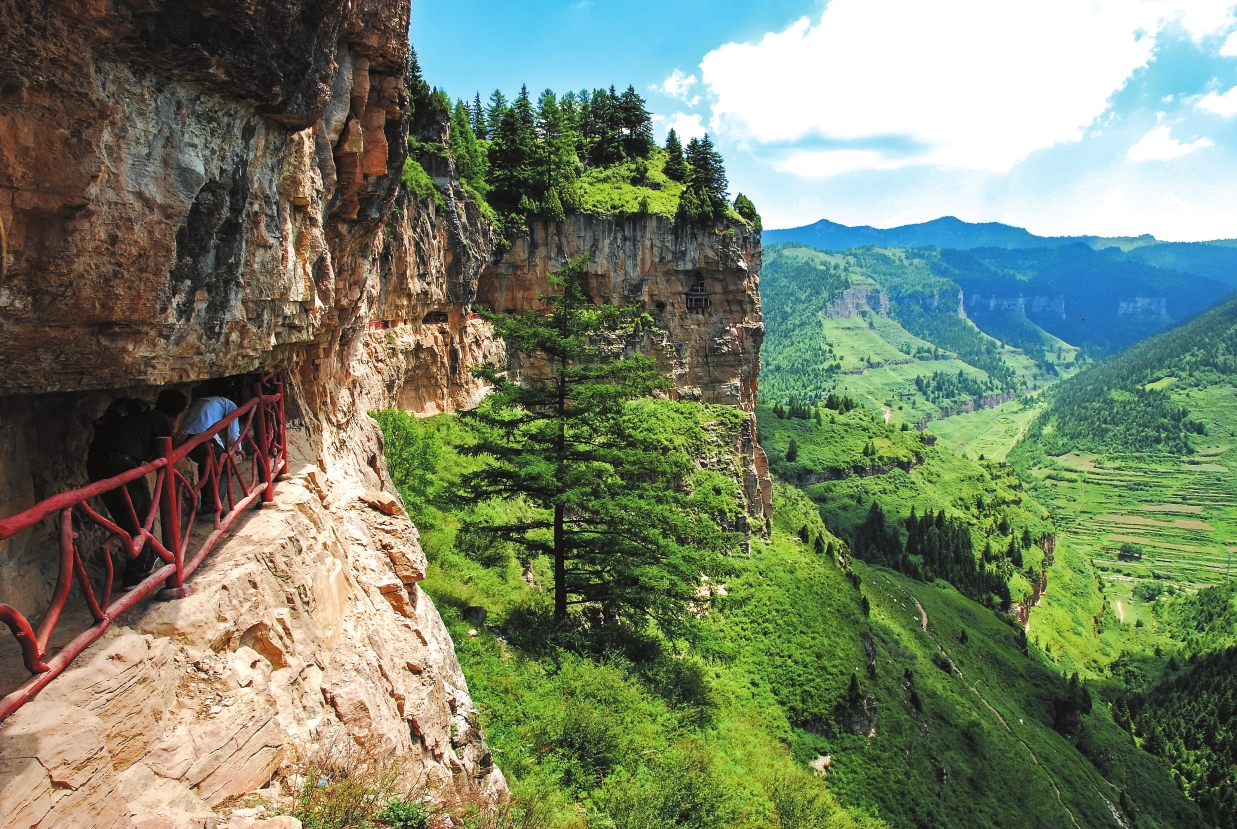 懸崖棧道位于寧武縣清真山,屬額狀丹霞巖地貌,由唐代貞元年間始建的佛教懸空古剎群與棧道共同構(gòu)成。棧道原長42華里,現(xiàn)有修復(fù)段5華里及羅漢殿、毗盧殿等建筑群,其中羅漢殿“回聲階”屬全國五大回聲建筑之一。懸崖棧道的攀爬較為艱險(xiǎn),需要兩個(gè)小時(shí),途中要攀登懸崖、臺(tái)階,還要穿越僅可容一人通過的山間隧道。