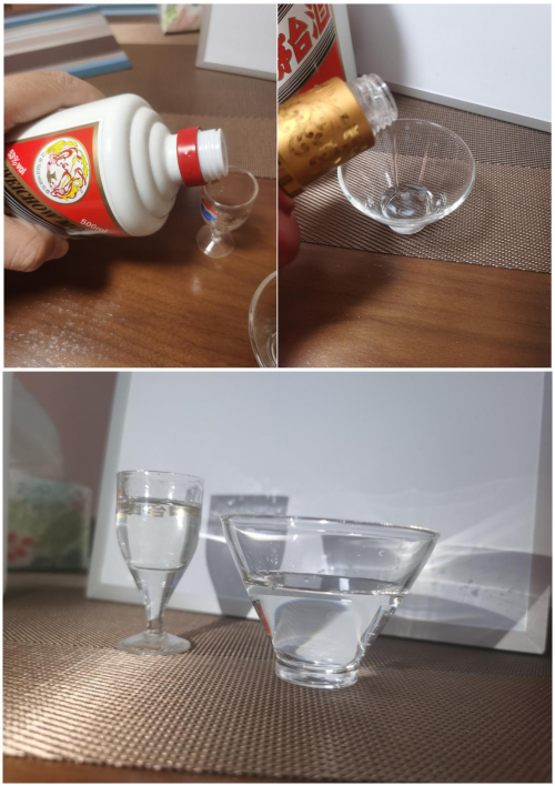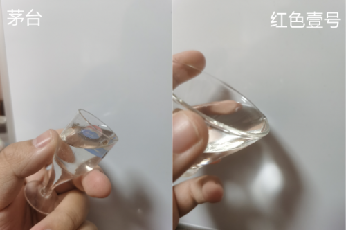 我還自創(chuàng)了一個(gè)項(xiàng)目,就是盡量?jī)A斜酒杯,因?yàn)橘A藏時(shí)間越長(zhǎng)的純糧酒的酒液張力大,到杯子邊上的時(shí)候會(huì)堆積起來(lái),不會(huì)直接倒出去,茅臺(tái)我記得一年半起步,紅色壹號(hào)我問(wèn)老板說(shuō)兩三年。試了一下,確實(shí)不分伯仲,但是茅臺(tái)杯子邊窄,可能占點(diǎn)便宜。
