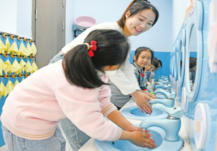 4月7日,浙江省臺州市仙居縣中心幼兒園小朋友在學習正確的洗手方法。世界衛(wèi)生日當日,各地舉行形式多樣的主題活動,倡導良好的衛(wèi)生習慣和健康的生活方式。