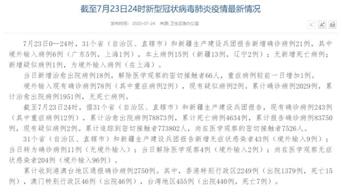 情況表示,截至7月23日24時(shí),據(jù)31個(gè)省(自治區(qū)、直轄市)和新疆生產(chǎn)建設(shè)兵團(tuán)報(bào)告,現(xiàn)有確診病例243例(其中重癥病例12例),累計(jì)治愈出院病例78873例,累計(jì)死亡病例4634例,累計(jì)報(bào)告確診病例83750例,現(xiàn)有疑似病例2例。累計(jì)追蹤到密切接觸者773802人,尚在醫(yī)學(xué)觀察的密切接觸者7526人。