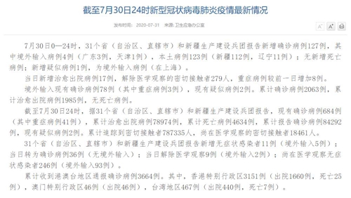 人民網(wǎng)北京7月31日電(董童)國家衛(wèi)生健康委于今日在官網(wǎng)發(fā)布的《截至7月30日24時新型冠狀病毒肺炎疫情最新情況》(以下簡稱“情況”)提出,7月30日0—24時,31個?。ㄗ灾螀^(qū)、直轄市)和新疆生產(chǎn)建設兵團報告新增確診病例127例,其中境外輸入病例4例(廣東3例,天津1例),本土病例123例(新疆112例,遼寧11例);無新增死亡病例;新增疑似病例1例,為境外輸入病例(在上海)。當日新增治愈出院病例17例,解除醫(yī)學觀察的密切接觸者279人,重癥病例較前一日增加8例。