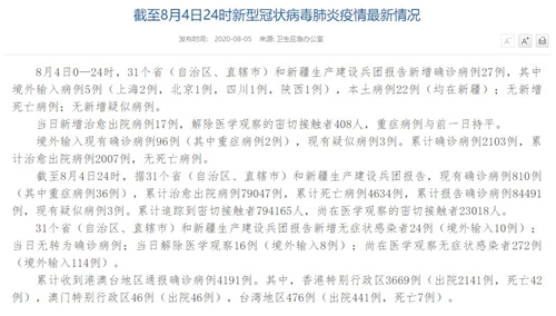情況顯示,截至8月4日24時,據(jù)31個?。ㄗ灾螀^(qū)、直轄市)和新疆生產(chǎn)建設(shè)兵團(tuán)報(bào)告,現(xiàn)有確診病例810例(其中重癥病例36例),累計(jì)治愈出院病例79047例,累計(jì)死亡病例4634例,累計(jì)報(bào)告確診病例84491例,現(xiàn)有疑似病例3例。累計(jì)追蹤到密切接觸者794165人,尚在醫(yī)學(xué)觀察的密切接觸者23018人。