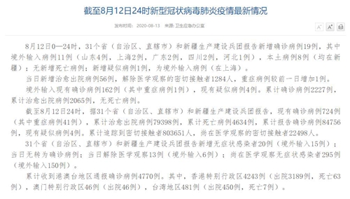 人民網(wǎng)北京8月13日電(董童)國(guó)家衛(wèi)生健康委于今日在官網(wǎng)發(fā)布的《截至8月12日24時(shí)新型冠狀病毒肺炎疫情最新情況》(以下簡(jiǎn)稱“情況”)提出,8月12日0—24時(shí),31個(gè)?。ㄗ灾螀^(qū)、直轄市)和新疆生產(chǎn)建設(shè)兵團(tuán)報(bào)告新增確診病例19例,其中境外輸入病例11例(山東4例,上海2例,廣東2例,四川2例,河北1例),本土病例8例(均在新疆);無(wú)新增死亡病例;新增疑似病例1例,為境外輸入病例(在上海)。當(dāng)日新增治愈出院病例56例,解除醫(yī)學(xué)觀察的密切接觸者1284人,重癥病例較前一日增加1例。