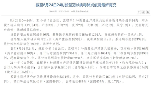 情況顯示,截至8月24日24時,據(jù)31個省(自治區(qū)、直轄市)和新疆生產(chǎn)建設兵團報告,現(xiàn)有確診病例386例(其中重癥病例10例),累計治愈出院病例79961例,累計死亡病例4634例,累計報告確診病例84981例,現(xiàn)有疑似病例2例。累計追蹤到密切接觸者812268人,尚在醫(yī)學觀察的密切接觸者12370人。