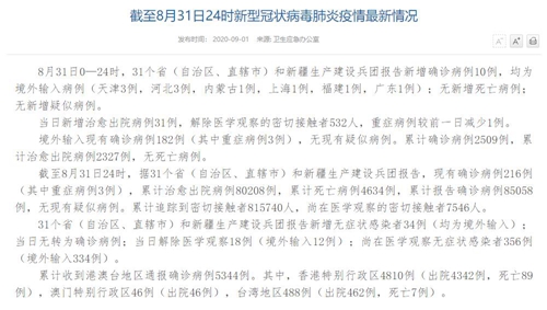 截至8月31日24時,據(jù)31個省(自治區(qū)、直轄市)和新疆生產(chǎn)建設(shè)兵團報告,現(xiàn)有確診病例216例(其中重癥病例3例),累計治愈出院病例80208例,累計死亡病例4634例,累計報告確診病例85058例,無現(xiàn)有疑似病例。累計追蹤到密切接觸者815740人,尚在醫(yī)學(xué)觀察的密切接觸者7546人。