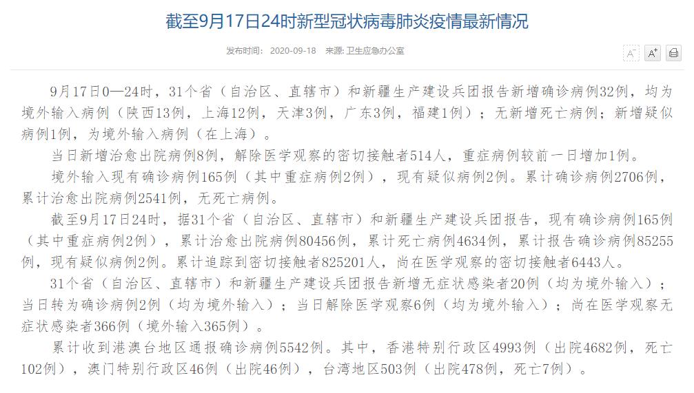 人民網(wǎng)北京9月18日電(董童)國家衛(wèi)生健康委于今日在官網(wǎng)發(fā)布的《截至9月17日24時(shí)新型冠狀病毒肺炎疫情最新情況》(以下簡稱“情況”)提出,9月17日0—24時(shí),31個(gè)?。ㄗ灾螀^(qū)、直轄市)和新疆生產(chǎn)建設(shè)兵團(tuán)報(bào)告新增確診病例32例,均為境外輸入病例(陜西13例,上海12例,天津3例,廣東3例,福建1例);無新增死亡病例;新增疑似病例1例,為境外輸入病例(在上海)。當(dāng)日新增治愈出院病例8例,解除醫(yī)學(xué)觀察的密切接觸者514人,重癥病例較前一日增加1例。