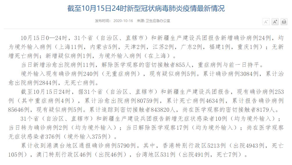 人民網(wǎng)北京10月16日電(董童)國(guó)家衛(wèi)生健康委于今日在官網(wǎng)發(fā)布的《截至10月15日24時(shí)新型冠狀病毒肺炎疫情最新情況》(以下簡(jiǎn)稱“情況”)提出,10月15日0—24時(shí),31個(gè)?。ㄗ灾螀^(qū)、直轄市)和新疆生產(chǎn)建設(shè)兵團(tuán)報(bào)告新增確診病例24例,均為境外輸入病例(上海11例,內(nèi)蒙古5例,天津2例,江蘇2例,廣東2例,福建1例,重慶1例);無(wú)新增死亡病例;新增疑似病例1例,為境外輸入病例(在上海)。當(dāng)日新增治愈出院病例11例,解除醫(yī)學(xué)觀察的密切接觸者855人,重癥病例與前一日持平。
