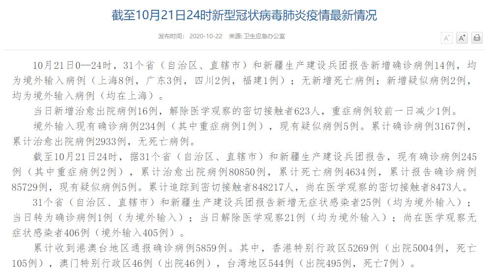 人民網(wǎng)北京10月22日電(董童)國家衛(wèi)生健康委于今日在官網(wǎng)發(fā)布的《截至10月21日24時新型冠狀病毒肺炎疫情最新情況》(以下簡稱“情況”)提出,10月21日0—24時,31個?。ㄗ灾螀^(qū)、直轄市)和新疆生產(chǎn)建設(shè)兵團報告新增確診病例14例,均為境外輸入病例(上海8例,廣東3例,四川2例,福建1例);無新增死亡病例;新增疑似病例2例,均為境外輸入病例(均在上海)。當日新增治愈出院病例16例,解除醫(yī)學觀察的密切接觸者623人,重癥病例較前一日減少1例。