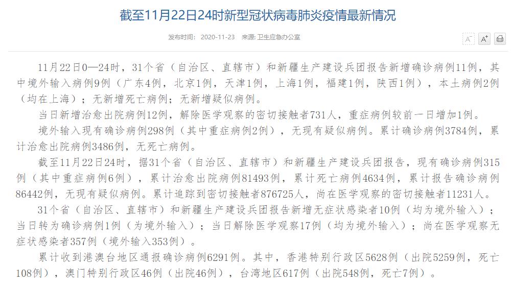 人民網(wǎng)北京11月23日電(董童)國家衛(wèi)生健康委于今日在官網(wǎng)發(fā)布的《截至11月22日24時新型冠狀病毒肺炎疫情最新情況》(以下簡稱“情況”)指出,11月22日0—24時,31個?。ㄗ灾螀^(qū)、直轄市)和新疆生產(chǎn)建設(shè)兵團(tuán)報(bào)告新增確診病例11例,其中境外輸入病例9例(廣東4例,北京1例,天津1例,上海1例,福建1例,陜西1例),本土病例2例(均在上海);無新增死亡病例;無新增疑似病例。當(dāng)日新增治愈出院病例12例,解除醫(yī)學(xué)觀察的密切接觸者731人,重癥病例較前一日增加1例。