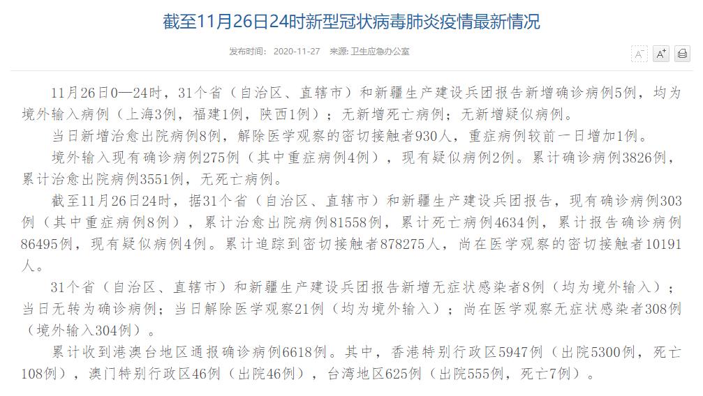 情況顯示,截至11月26日24時,據(jù)31個省(自治區(qū)、直轄市)和新疆生產(chǎn)建設(shè)兵團報告,現(xiàn)有確診病例303例(其中重癥病例8例),累計治愈出院病例81558例,累計死亡病例4634例,累計報告確診病例86495例,現(xiàn)有疑似病例4例。累計追蹤到密切接觸者878275人,尚在醫(yī)學(xué)觀察的密切接觸者10191人。