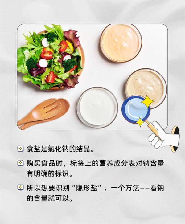 日常飲食要控鹽。有些食品嘗起來并不咸,但含鹽量卻相當(dāng)高,因?yàn)楹胁簧佟半[形鹽”。食鹽是氯化鈉的結(jié)晶,購買食品時(shí),標(biāo)簽上的營養(yǎng)成分表對鈉含量有明確的標(biāo)識。所以想要識別“隱形鹽”,可以看標(biāo)簽上鈉的含量。(來源:科普中國)