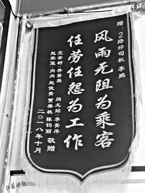 撿到東西歸還失主,失主送來表揚信比較常見,山西晚報記者發(fā)現(xiàn)有一張比較例外。一位署名“2路乘客”的感謝信中這樣寫道:“2017年以前,可以說偶爾坐2路,因為經(jīng)常會有等不上車的情況。但自從李鵬接上2路以后,基本上沒出現(xiàn)過等不上車的情況……作為長期乘坐公交的乘客真心非常感謝……”錦旗是7名乘客集體送的,“風(fēng)雨無阻為乘客,任勞任怨為工作”,14個字,表達的是乘客對李鵬的認可。