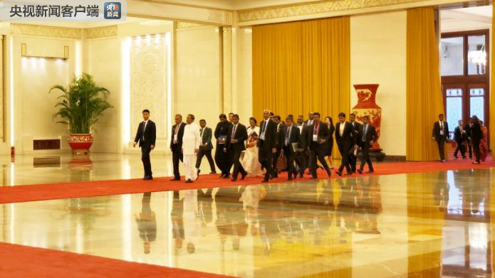 △斯里蘭卡總統(tǒng)西里塞納率團(tuán)抵達(dá)人民大會堂與習(xí)近平會面。(央視記者許永松拍攝)