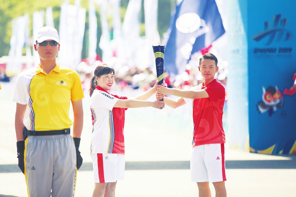 當(dāng)日一早,八一廣場上藍色會旗迎風(fēng)招展,鼓樂喧天,在《歌唱祖國》嘹亮的歌聲中,火炬?zhèn)鬟f起跑儀式拉開序幕。在由火種點燃的圣火盆前,長治市領(lǐng)導(dǎo)將點燃的火炬交給火炬?zhèn)鬟f的第一棒、長治籍太極拳世界冠軍崔碧暉,在火炬護衛(wèi)手的護衛(wèi)下,自東向西,精神抖擻地開啟了傳遞征程。當(dāng)天,潞州區(qū)的火炬?zhèn)鬟f共48棒,火炬手中有“匠心筑夢”的大國工匠,也有支撐長治“好人城市”的全國道德模范,還有身殘志堅勇奪世界冠軍的殘疾人運動員……不論年齡,無關(guān)崗位,他們身上都體現(xiàn)著屬于這個時代的拼搏與風(fēng)采。