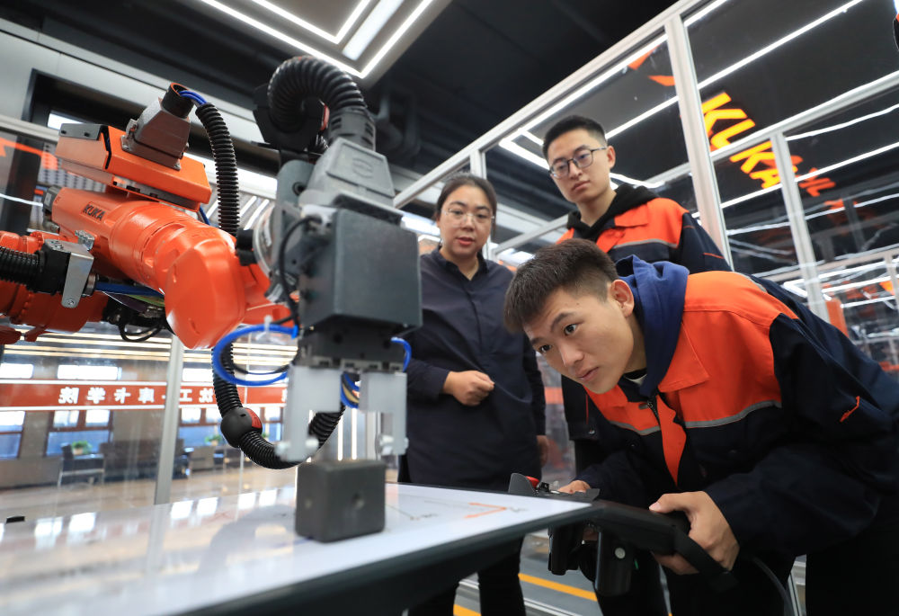 2024年11月22日,沈陽工學(xué)院電氣工程及自動化專業(yè)學(xué)生操作機器人進(jìn)行物料碼垛實訓(xùn)。近年來,沈陽以產(chǎn)業(yè)需求為導(dǎo)向,促進(jìn)技術(shù)院校與知名企業(yè)共建高水平新型工業(yè)化實踐教學(xué)中心,構(gòu)建校企協(xié)同合作推進(jìn)產(chǎn)教深度融合,促進(jìn)學(xué)生高質(zhì)量就業(yè)。新華社記者 楊青 攝