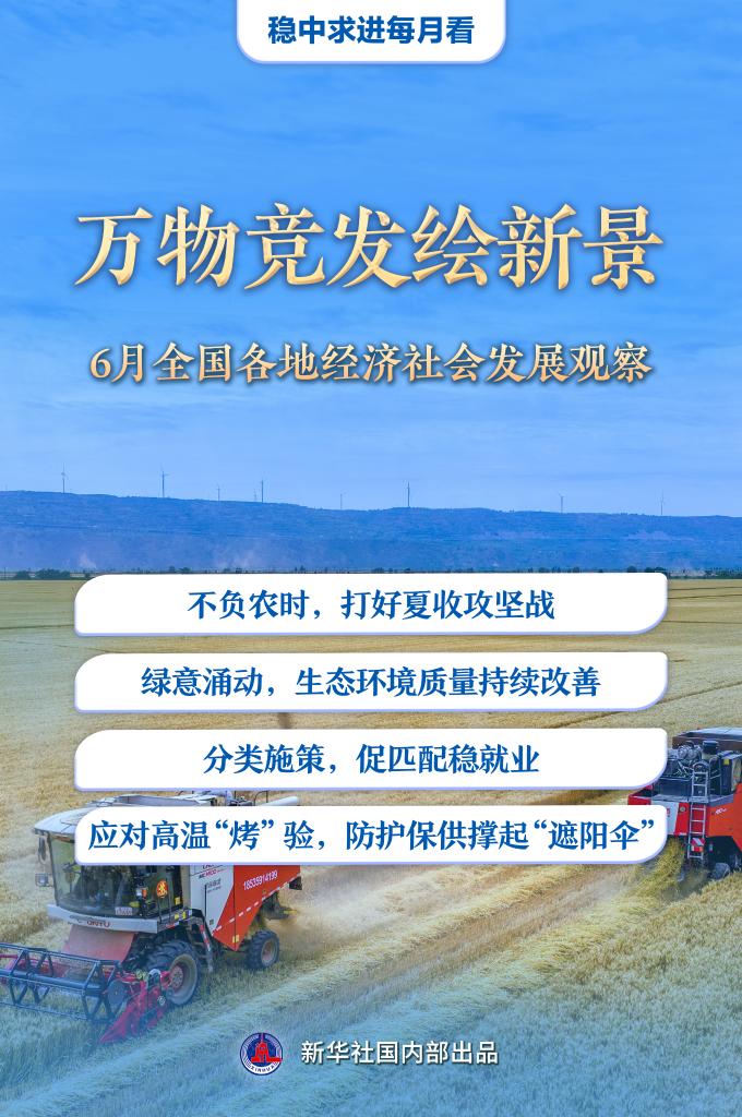 6月仲夏,萬(wàn)物豐茂。廣袤農(nóng)田上,“三夏”生產(chǎn)進(jìn)入關(guān)鍵階段;綠水青山間,低碳發(fā)展不斷繪就新圖景;全力穩(wěn)就業(yè),政府、企業(yè)與高校同頻共振;高溫“烤”驗(yàn)下,做好各項(xiàng)保障工作……上半年收官之月,各地各部門(mén)統(tǒng)籌推進(jìn)穩(wěn)增長(zhǎng)、促改革、惠民生舉措,推動(dòng)經(jīng)濟(jì)社會(huì)沿著高質(zhì)量發(fā)展之路穩(wěn)步前行。