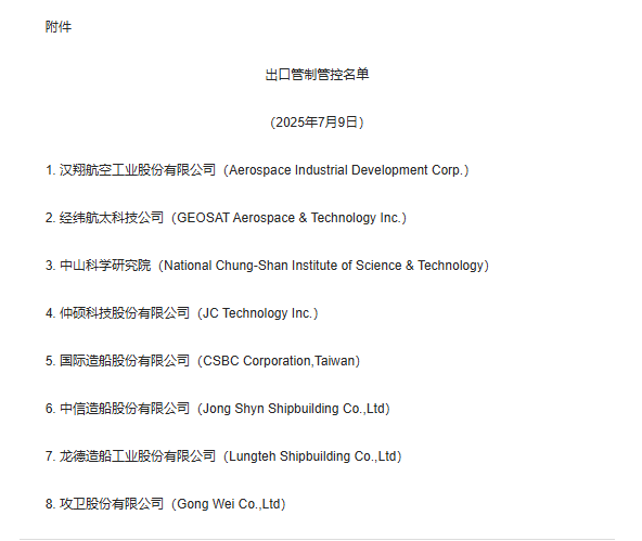 商務(wù)部公告2025年第35號(hào) 公布將8家臺(tái)灣地區(qū)實(shí)體列入出口管制管控名單