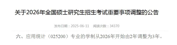 6月11日,中央民族大學發(fā)布《關于2026年全國碩士研究生招生考試重要事項調(diào)整的公告》,明確規(guī)定:應用統(tǒng)計(025200)專業(yè)的學制從2026年開始由2年調(diào)整為3年。