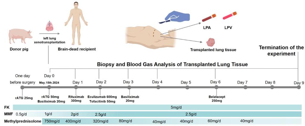 廣州醫(yī)科大學附屬第一醫(yī)院教授何建行率領的研究團隊,將一只經(jīng)過基因編輯的巴馬香豬左肺移植到一名腦死亡者體內(nèi),模擬臨床常見的單肺移植手術。該供體豬經(jīng)過6處基因編輯,以降低其器官移植到人體后的免疫風險。手術后,呼吸、血液、影像等監(jiān)測數(shù)據(jù)顯示,移植肺維持通氣與氣體交換功能長達9天,其間未發(fā)生超急性排異反應,同步病原學監(jiān)測也未發(fā)現(xiàn)活躍感染跡象。