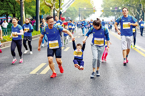 11月4日,多地舉辦馬拉松比賽,眾多長跑愛好者參與其中,享受運(yùn)動帶來的快樂。圖為家長帶著孩子參加浙江杭州舉行的馬拉松比賽。據(jù)新華社 徐暉 攝