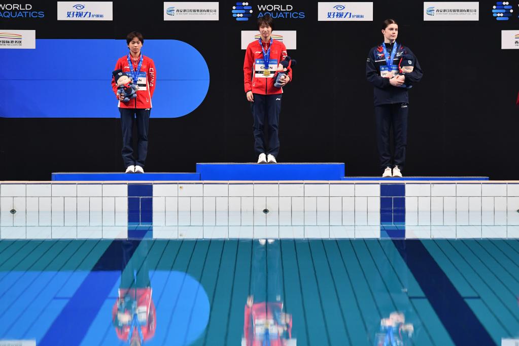 4月16日,冠軍中國選手陳芋汐(中)、亞軍中國選手全紅嬋(左)與季軍英國選手西里埃在頒獎(jiǎng)儀式上。新華社記者 張博文 攝