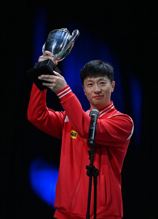 當日兩場單打決賽之間,國際乒聯(lián)為2015年至2019年完成世乒賽男單三連冠的馬龍頒發(fā)了復(fù)刻圣·勃萊德杯。(蘇斌、謝江)