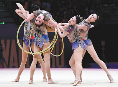 中國藝術(shù)體操隊(duì)的良好狀態(tài)延續(xù)到最后一個(gè)比賽日。在5圈單項(xiàng)決賽中,率先登場的中國隊(duì)高質(zhì)量地完成整套動(dòng)作,以36.550分獲得金牌,為中國藝術(shù)體操隊(duì)贏得首個(gè)世界冠軍。在隨后進(jìn)行的3帶2球單項(xiàng)決賽中,中國隊(duì)依舊發(fā)揮亮眼,以32.800分收獲一枚銀牌。