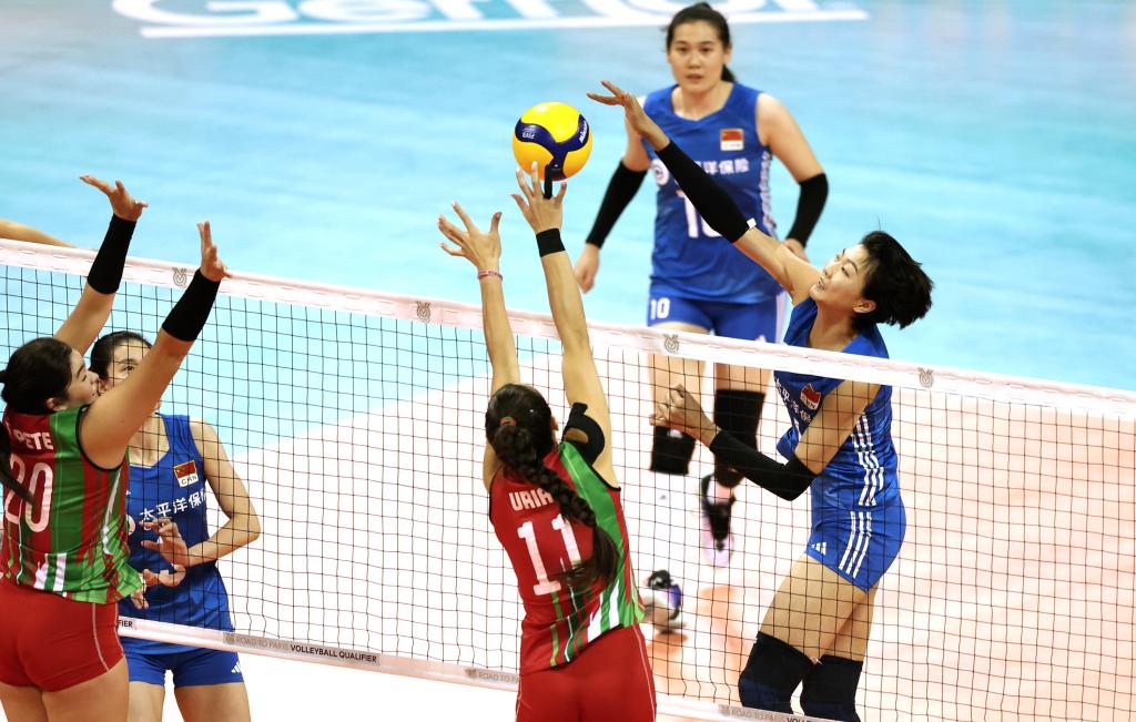 9月17日,中國隊球員袁心玥(右一)在比賽中扣球。當(dāng)日,在浙江省寧波市舉行的巴黎奧運會女排資格賽A組比賽中,中國隊以3:0戰(zhàn)勝墨西哥隊。新華社記者 陳斌 攝