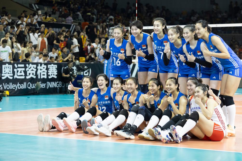 9月17日,中國隊球員在賽后合影。當(dāng)日,在浙江省寧波市舉行的巴黎奧運會女排資格賽A組比賽中,中國隊以3:0戰(zhàn)勝墨西哥隊。新華社記者 張濤 攝