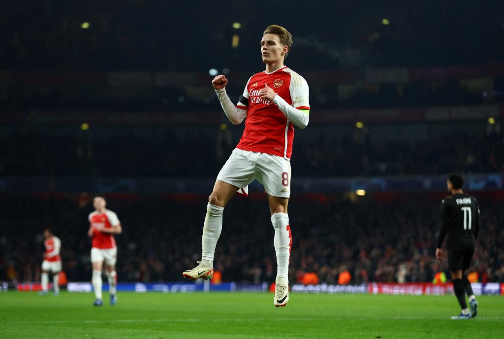11月29日,阿森納隊(duì)球員厄德高在比賽中慶祝進(jìn)球。