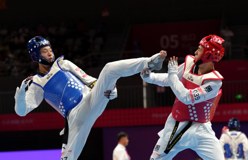 9月27日,杭州亞運(yùn)會(huì)跆拳道男子80公斤級(jí)比賽中,崔陽(左)在1/16淘汰賽中戰(zhàn)勝中國香港選手譚政南。新華社記者江文耀攝