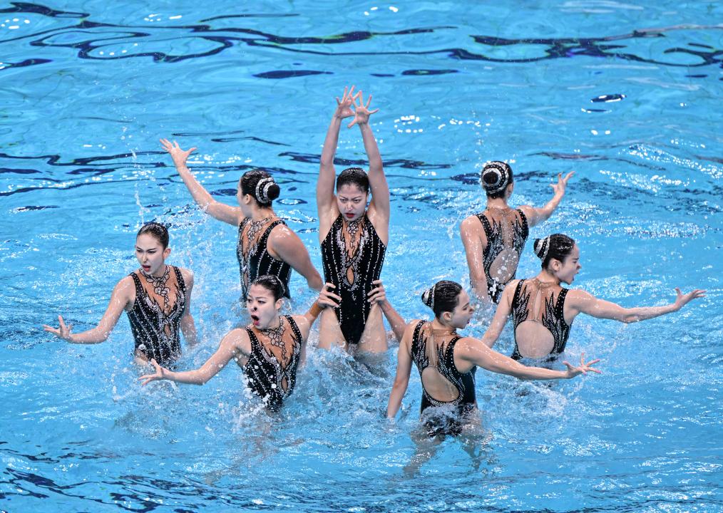 4月7日,中國隊在比賽中。當日,在國家游泳中心“水立方”舉行的2024年花樣游泳世界杯(北京站)集體技巧自選比賽中,中國隊以205.0300分的成績獲得亞軍。新華社記者 夏一方 攝