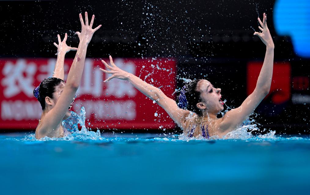 4月7日,中國組合林彥含/徐匯妍(右)在比賽中。當日,在國家游泳中心“水立方”舉行的2024年花樣游泳世界杯(北京站)女子雙人自由自選比賽中,中國組合林彥含/徐匯妍以221.0156分的成績獲得亞軍。新華社記者 夏一方 攝