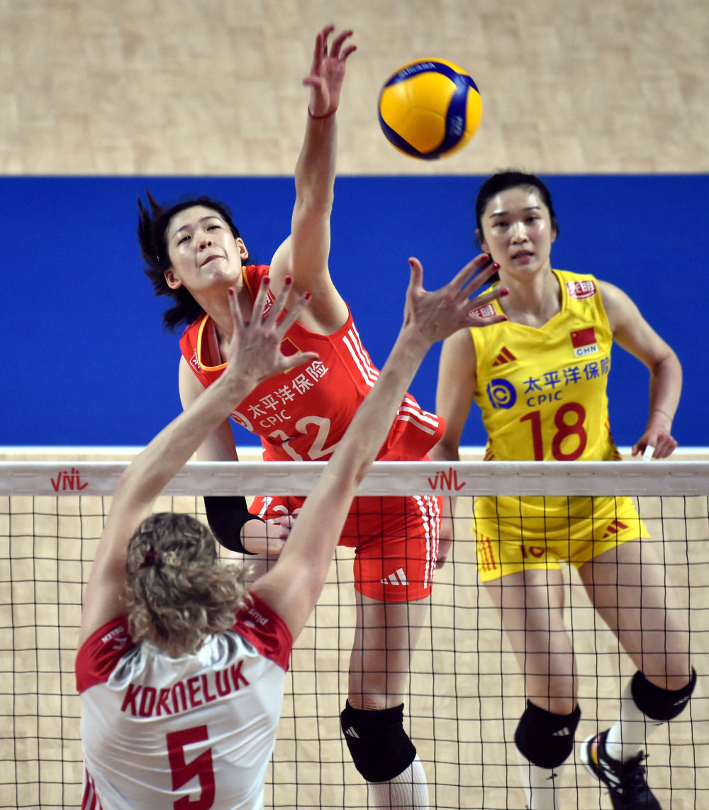 6月16日,中國隊球員袁心玥(中)在比賽中吊球。新華社記者 盧炳輝 攝