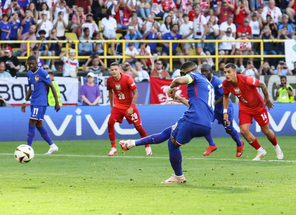 法國頭號球星姆巴佩本場復(fù)出成為全場焦點,他在下半場通過點球建功,打入了個人在歐錦賽上的首粒進球。比賽尾聲階段,波蘭隊同樣獲得一粒點球,萊萬多夫斯基主罰命中將比分定格為1:1。