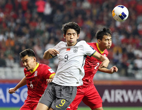 2月15日,中國隊(duì)球員劉誠宇(中)在比賽中爭頂。當(dāng)日,在深圳舉行的2025亞足聯(lián)U20亞洲杯小組賽中,中國隊(duì)5:2戰(zhàn)勝吉爾吉斯斯坦隊(duì)。新華社記者 劉大偉 攝