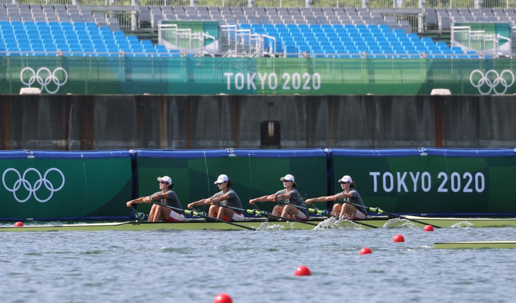2021年7月20日,中國(guó)賽艇隊(duì)女子四人雙槳隊(duì)員在訓(xùn)練中。當(dāng)日,中國(guó)賽艇隊(duì)在日本東京海之森水上競(jìng)技場(chǎng)訓(xùn)練,備戰(zhàn)即將開幕的東京奧運(yùn)會(huì)。新華社記者 杜瀟逸 攝