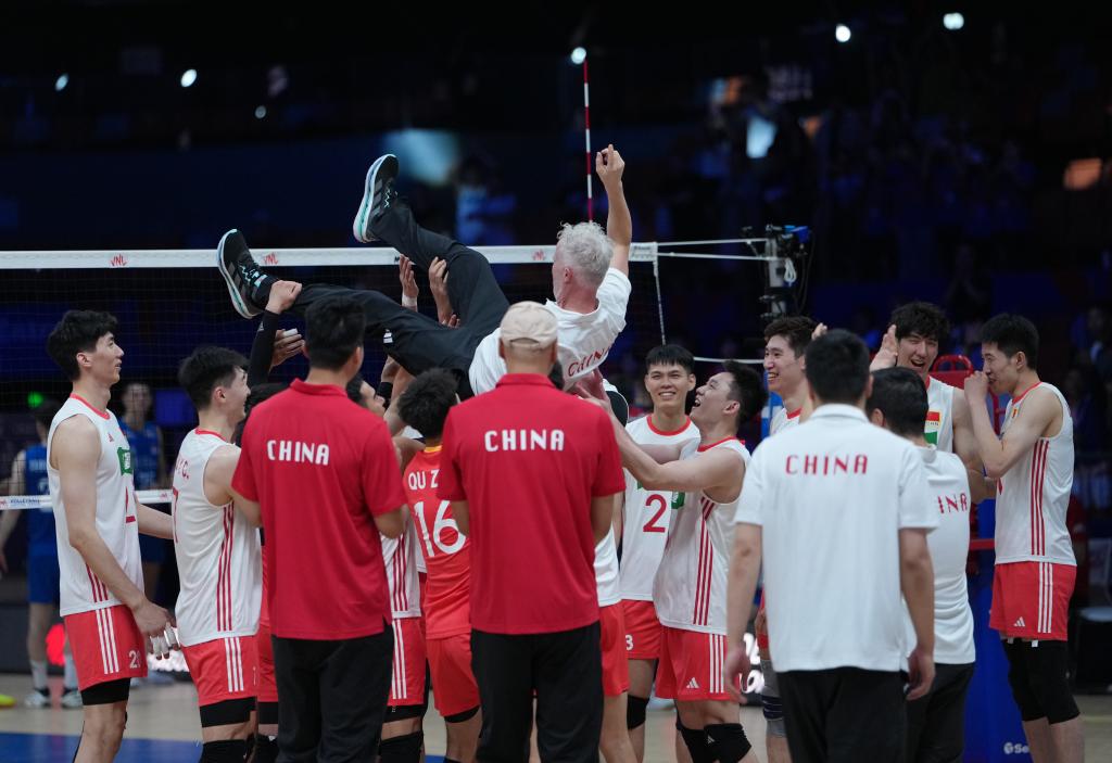 6月12日,中國隊(duì)球員在比賽后拋起主教練海寧(上)慶祝。新華社記者 李一博 攝