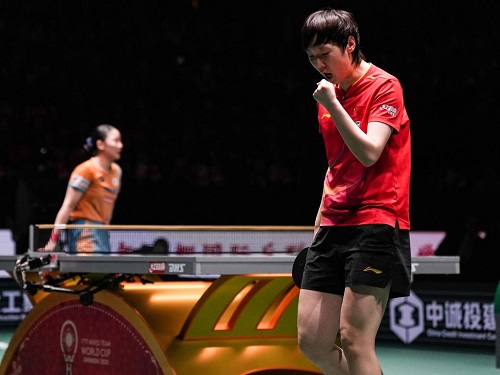 12月7日,王曼昱(右)在女單比賽中慶祝得分。新華社記者 王曦 攝