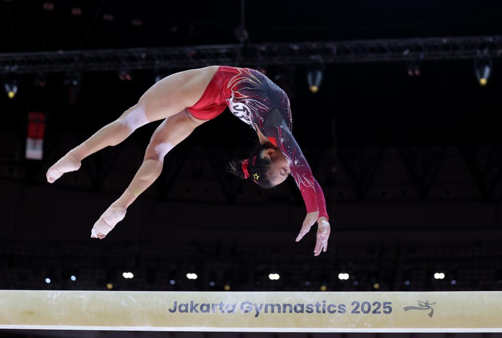 10月25日,中國選手張清穎在2025年國際體操聯(lián)合會(huì)(FIG)競(jìng)技體操世錦賽女子平衡木決賽中奪得冠軍。新華社記者 白雪飛 攝
